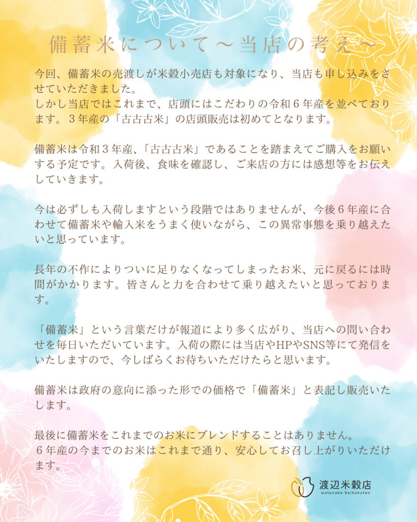 備蓄米に関して~当店の考え~